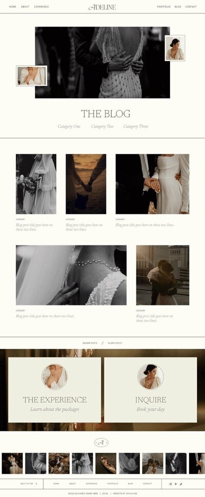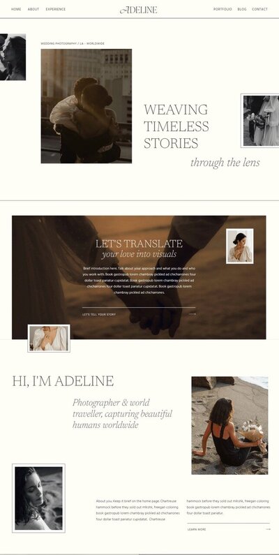 Adeline is a nostalgic and dreamy Showit website template designed for photographers and wedding industry creatives who are looking to create a refined and elevated yet welcoming online presence. With elegant typography, delicate details, and a clean balanced layout, Adeline highlights your work while creating a seamless experience for your visitors.