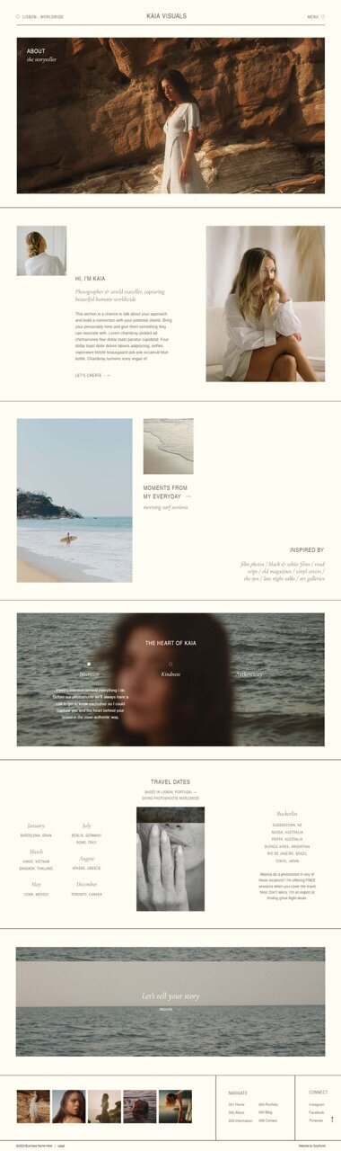 Kaia is a minimalistic and clean Showit website template for editorial and cinematic photographers and creative entrepreneurs. With its sleek typography, intentional white space, and elegant design, Kaia highlights your work and creates a refined and seamless experience for your dream clients.